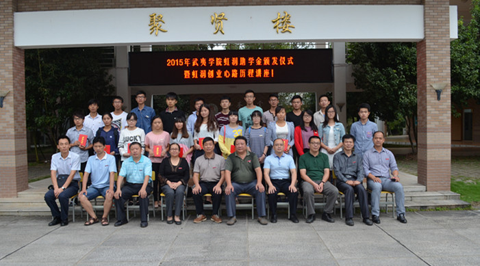姚進生、林善平等與會領(lǐng)導為獲得虹潤助學金的同學頒發(fā)了證書。林善平用自己的創(chuàng)業(yè)歷程告訴同學們要尊重自我,在暫時的逆境中砥礪品格,磨練意志,用自己的努力不斷增長知識和才干,在以后的人生歷程中選擇更輝煌的道路。