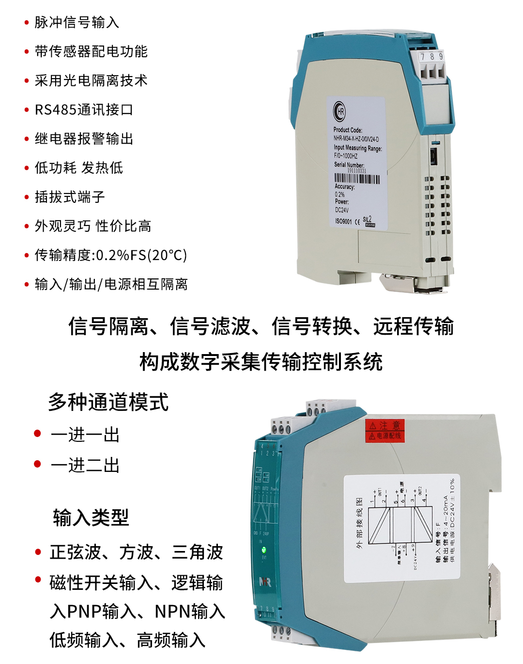 NHR-M34系列智能頻率轉(zhuǎn)換器將頻率信號(hào)經(jīng)隔離整形放大后,變送隔離輸出所需的信號(hào),也可向現(xiàn)場(chǎng)的一次儀表提供電源回路。