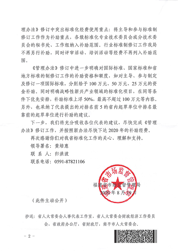 2020年8月19日,福建省市場(chǎng)監(jiān)督局就我的建議作出閩市監(jiān)函[2020]247號(hào)答復(fù),答復(fù)中表示,省政府已批準(zhǔn)新增加1080萬(wàn)元資金用于我省標(biāo)準(zhǔn)化專(zhuān)項(xiàng)資金補(bǔ)助。至此標(biāo)準(zhǔn)化專(zhuān)項(xiàng)資金問(wèn)題得以解決。