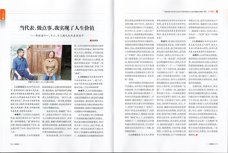 林善平:虹潤公司是民營的國家高新技術(shù)企業(yè)、國家專精特新小巨人企業(yè),處于國內(nèi)顯示控制儀表行業(yè)的領(lǐng)先地位。沒當(dāng)選代表前,我的人生目標(biāo)只有一個——“造一流儀表”,而自從跨進(jìn)議政履職平臺后,我的人生目標(biāo)又增加了一個——“當(dāng)稱職的代表”。為了當(dāng)好代表,我在履職之初就給自己劃了一條“底線”:本職工作和商務(wù)活動再忙,只要是人大的會議、省市人大組織的集體履職活動,就必定參加。如果時間上有沖突,公司的事就“讓路”一下。記得有一次,我到福州參加省人代會,一位客商在順昌的公司總部等了我好幾天,最后等不住,只好取消了合作。即便如此,我仍然不改初衷。而且,于我來說,履職對我更好地經(jīng)營管理企業(yè)有很大的幫助。擔(dān)任代表職務(wù),使我開闊了視野,對黨和國家的大政方針政策、法律法規(guī)有了更多更好的領(lǐng)會,民主意識、法治意識、誠信意識更強(qiáng)了,有助于辦好企業(yè)、規(guī)范管理、開拓市場、規(guī)避風(fēng)險。10多年來,公司的核心競爭力不斷增強(qiáng),生產(chǎn)與銷售持續(xù)領(lǐng)跑全行業(yè),被評為國家知識產(chǎn)權(quán)優(yōu)勢企業(yè)、福建省七家入選國家智能制造標(biāo)準(zhǔn)應(yīng)用試點企業(yè)之一、福建省十家院士專家示范工作站之一,“虹潤”成為“中國馳名商標(biāo)”。