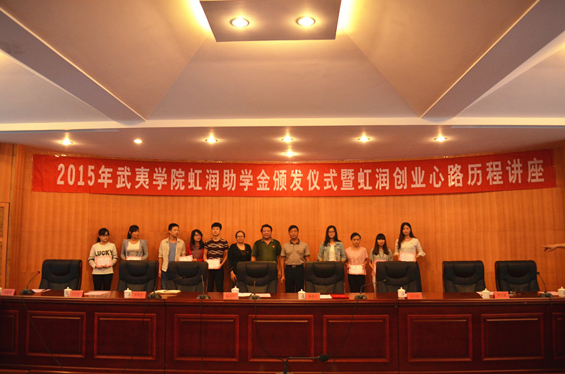 姚進生、林善平等與會領(lǐng)導為獲得虹潤助學金的同學頒發(fā)了證書。林善平用自己的創(chuàng)業(yè)歷程告訴同學們要尊重自我,在暫時的逆境中砥礪品格,磨練意志,用自己的努力不斷增長知識和才干,在以后的人生歷程中選擇更輝煌的道路。